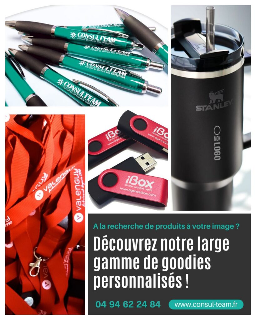 Goodies personnalisés Consulteam Agency vous propose une sélection originale d’articles personnalisables aux couleurs de votre entreprise, association, administration ou Comité d’Entreprise. Commander vos goodies personnalisés Que vous ayez besoin de stylos, sacs, t-shirts, gadgets high-tech, ou objets écoresponsables, nous proposons une large gamme de produits personnalisables pour toutes vos campagnes marketing, événements professionnels, ou cadeaux clients. Découvrez Notre Catalogue
